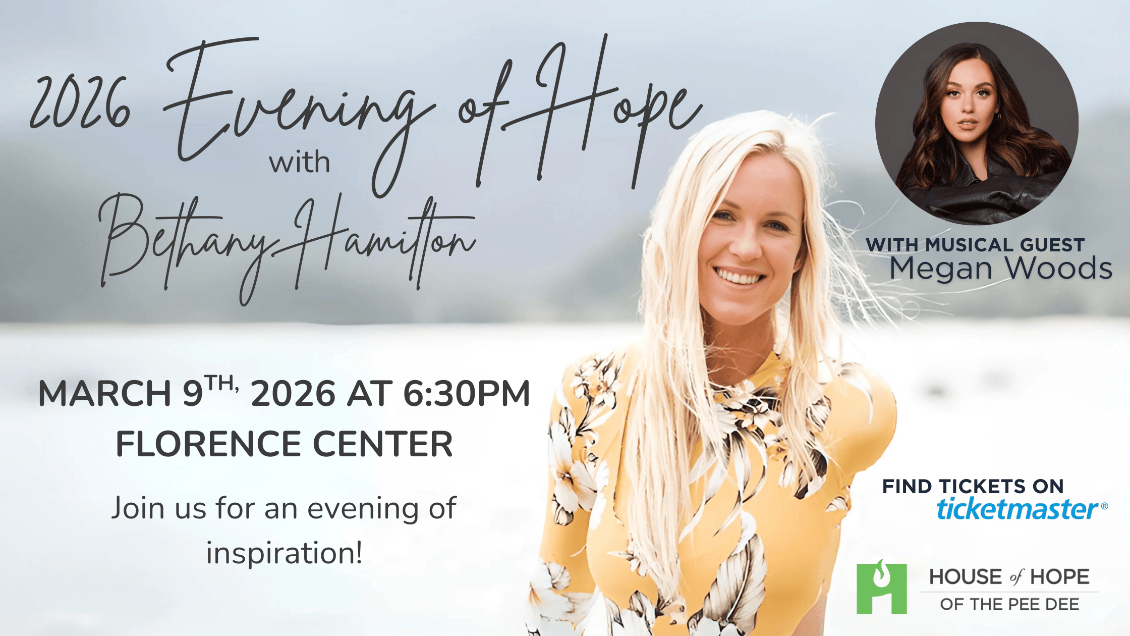 This year's Evening of Hope will feature surf star Bethany Hamilton. On Monday March 9th, 2026 we will have the opportunity to hear how Bethany's life was changed when she lost her arm in a shark attack, and how God is using her now. Sponsorships are available and individual tickets will go on sale in the Fall. For more information contact Julie Maxham at jmaxham@hofh.org.